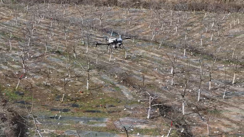 当前正值苹果树萌芽、孕蕾关键期,神峪乡下关村北山苹果示范基地内,植保无人机腾空而起,按预设航线均匀喷洒水肥药液。原本需几十人忙活一天的工作量,如今几架无人机几小时便可完成。