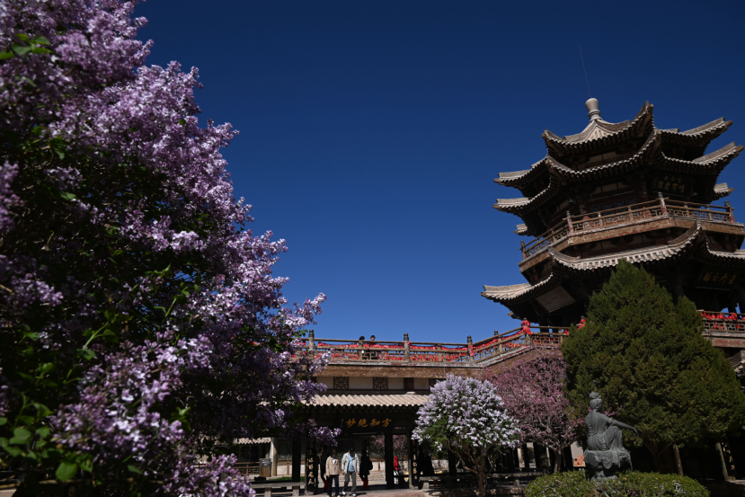 清明时节,甘肃省敦煌市鸣沙山月牙泉景区内的梨花、丁香花、桃花竞相绽放,与大漠、泉水、蓝天构成了一幅迷人春色画卷。(文/图 张晓亮)