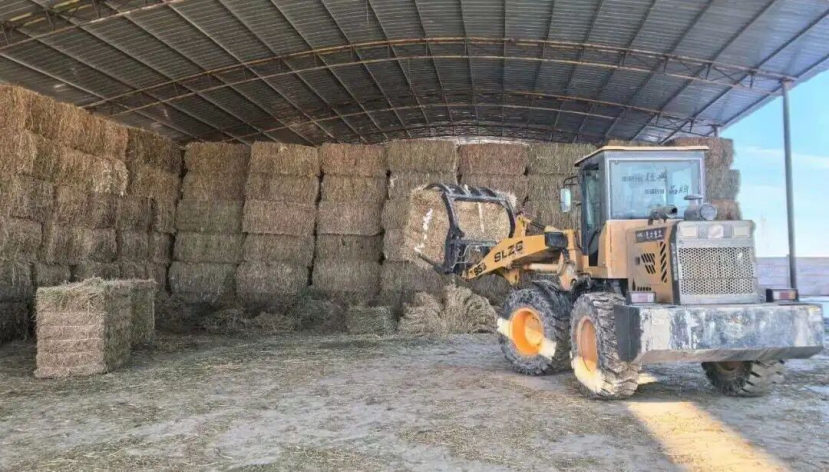 在草香香农业发展有限公司,一辆辆满载秸秆饲草的货运车辆有序停靠,机械设备来回作业,工人们忙着吊装、装卸、转运,运输、卸料、入库衔接顺畅,呈现出产销两旺的火热场面。