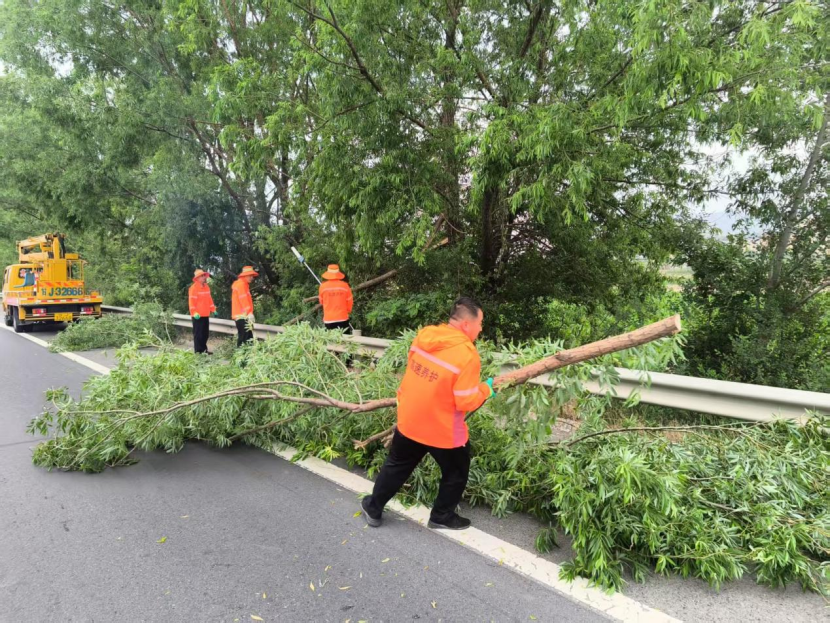 然而,定西的秋天也不全是晴天。暴雨如注,定西高速的防汛一线,处处跃动着“守护橙”。那是养护队员的颜色,也是风雨中最让人安心的颜色。巡检人员迎风斗雨,逆行向前。雨水顺着帽檐成股流下,模糊了视线,可他们脚下的步伐却一刻未停——每一米路基、每一处边坡,都要亲眼看过才放心。“前面有树倒了!”对讲机里一声喊,几个人扛着电锯就冲了过去。一棵碗口粗的树木倾斜在路面上,枝枝叶叶被风雨打得七零八落。他们顾不上擦一把脸上的雨水,拉响电锯便投入了作业,树干被一段段锯开、拖走,路面逐渐恢复了畅通。养护员小刘直起腰,抹了一把脸上的汗水,喘着粗气说了句:“雨不停,人不撤。路通畅,心才安。”我的镜头里,橙色身影在雨幕中若隐若现,他们用最朴实的行动,在风雨中为万千司乘筑起最坚实的安全屏障。