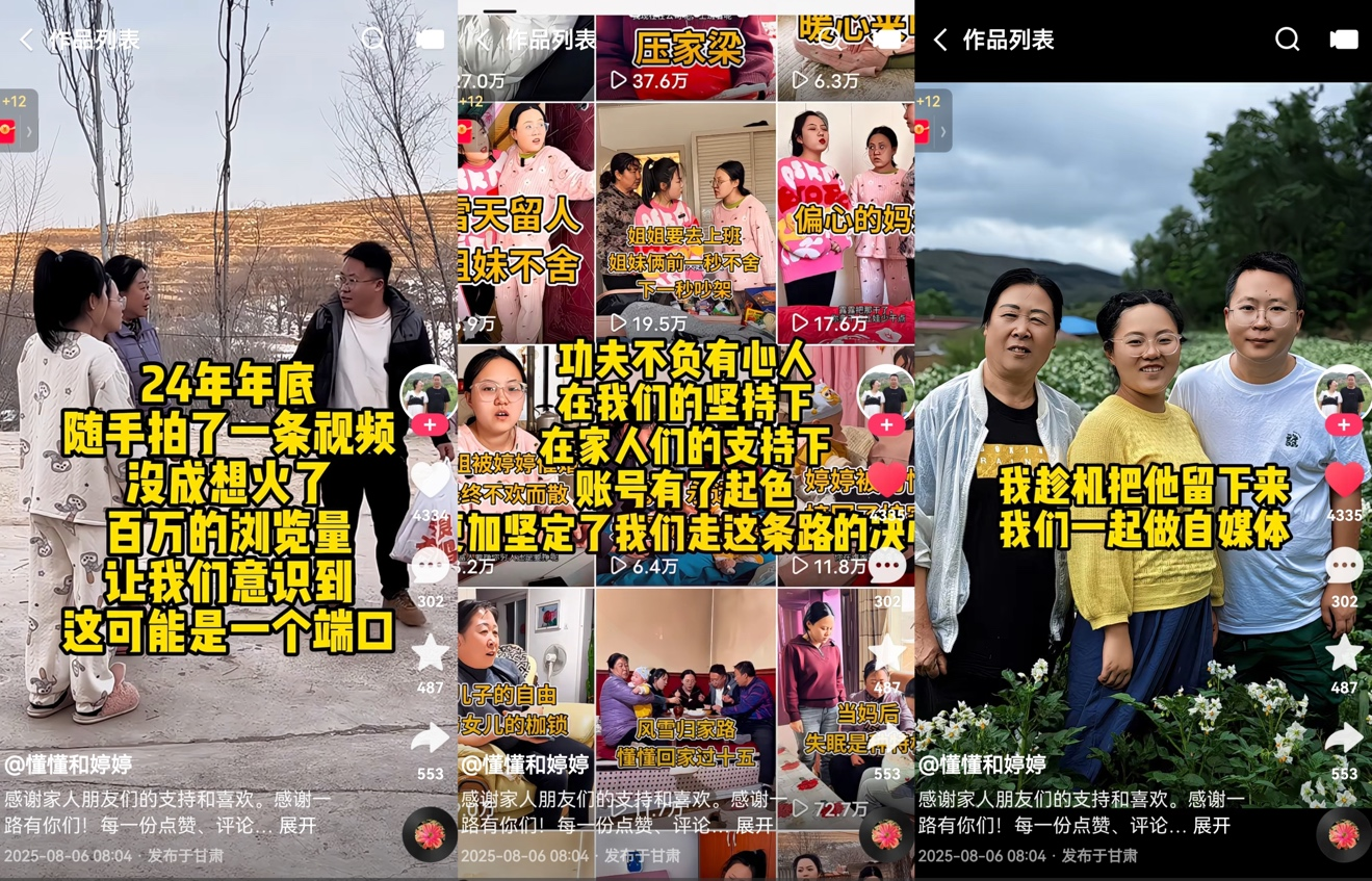 两人都是90后,分别毕业于兰州文理学院和兰州财经大学。懂懂学的是数字媒体技术,做过拍摄、剪辑、电商相关工作;婷婷学的是音乐表演,做过音乐老师。如今,他们共同运营的快手账号就叫 “懂懂和婷婷”。对外看,这是一个记录农村家庭日常、婆媳相处、带娃生活和返乡创业的三农账号;但对他们自己来说,这更像是一条在现实压力里一点点试出来的新路。
