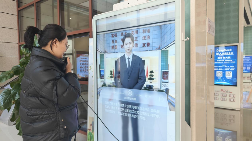 “AI数字人”以其独特的AI交互功能,提供线下沉浸式的交互体验,其具备强大的智能交互能力与丰富的政务知识储备,以实体大厅AI导服身份赋能咨询、导办、自助、热线等全流程服务环节。无论是讲解营业执照相关业务,还是办理其他政务事项,办事群众仅需要通过日常对话即可获取精准业务指南,涵盖材料清单、审批时限、注意事项等核心要素,实现政务服务“秒级响应”。