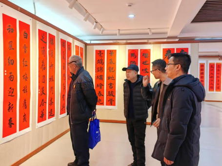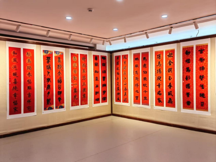 展厅内墨香四溢、年味浓郁,红彤彤的春联整齐陈列,吸引众多市民及书法爱好者驻足观赏、品读联句、拍照打卡。观众们在一字一句间领略文字之美,在一撇一捺中感受书法魅力,在楹联寓意里体悟新春祝福。