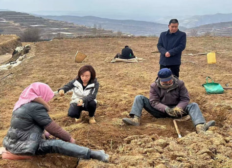 乡干部下沉一线,深入田间地头实地查看党参苗采挖进度、品质长势及分拣包装情况