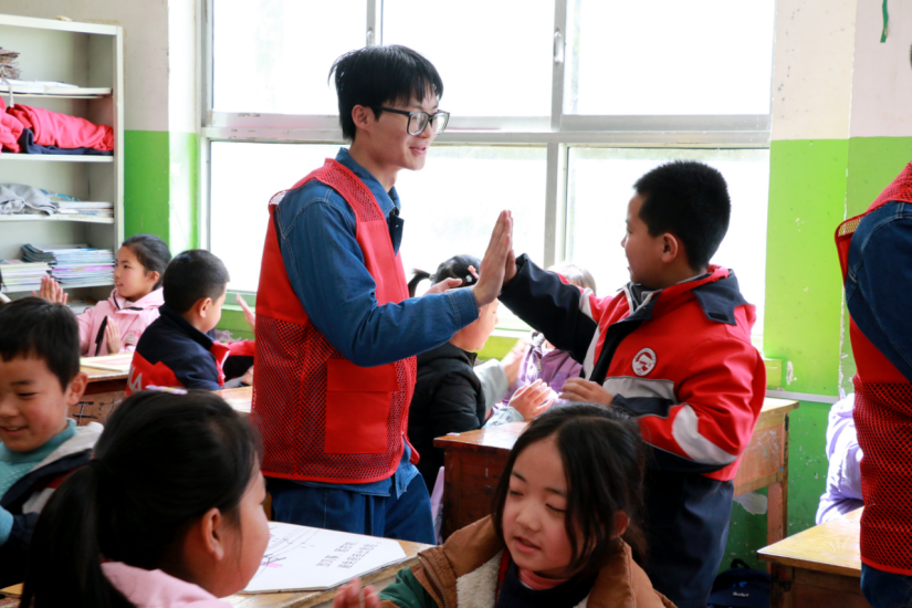 “黄河之滨”志愿者服务队队员隆永鑫和同学们一起互动安全用电拍手歌