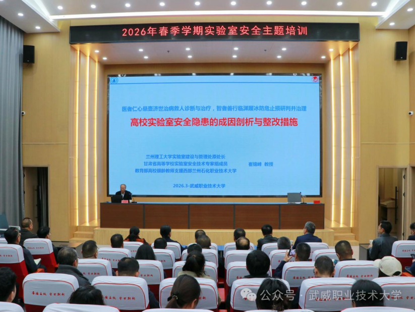 中国甘肃网3月17日讯(西北角·中国甘肃网记者 张振国)为压实实验室安全责任,强化全员安全红线意识,提升实验室安全管理水平和应急处置能力,近日,武威职业技术大学邀请兰州理工大学实验室建设与管理处原处长、甘肃省高等学校实验室安全技术专家组成员崔锦峰教授,开展2026年春季学期实验室安全主题培训。