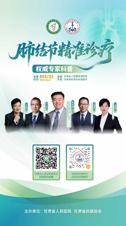 为守护甘肃地区群众健康,回应大众对肺结节的认知需求与健康焦虑,甘肃省人民医院联合甘肃省抗癌协会,特邀国内著名胸外科权威专家、北京大学肿瘤医院胸外科主任、中国医师协会胸外科医师分会副会长、甘肃省人民医院柔性引进专家——陈克能教授做客直播间,与大家进行面对面云端交流,开展肺结节精准诊疗专场直播。
