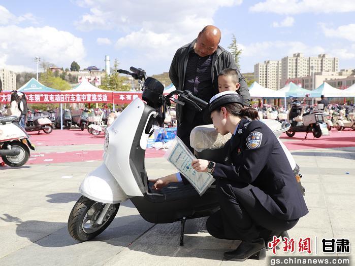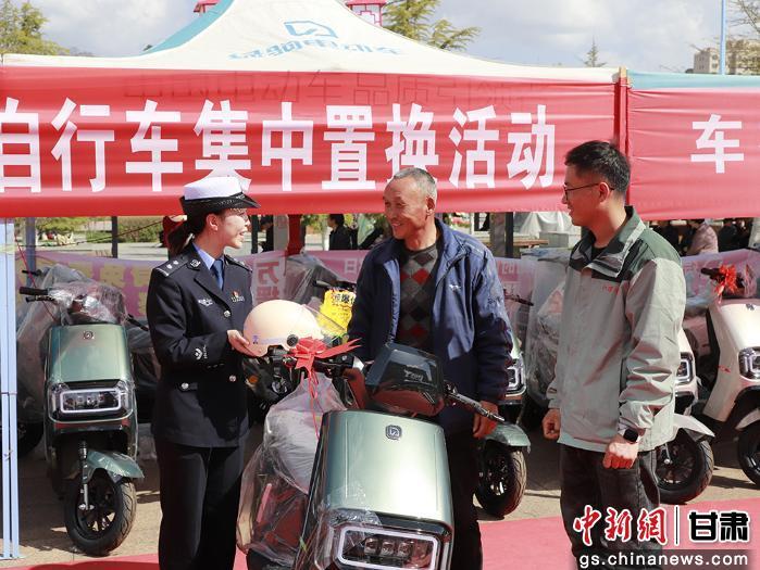 3月30日,西和县伏羲广场,“旧车当钱花,新车骑回家”惠民活动现场人头攒动。何坝镇村民靳怀民推着骑了三年多的老旧电动车来到现场,在民警指导下完成置换手续——旧车抵扣1000元,新车当场挂牌,还免费领到安全头盔。